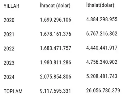Gürcistan’a yönelik ihracattaki artış da dikkati çekti. Bu ülkeye yapılan ihracat 2020’de 29 milyon 685 bin dolarken, 2024’te 4 katına çıkarak 124 milyon 344 bin doları buldu.