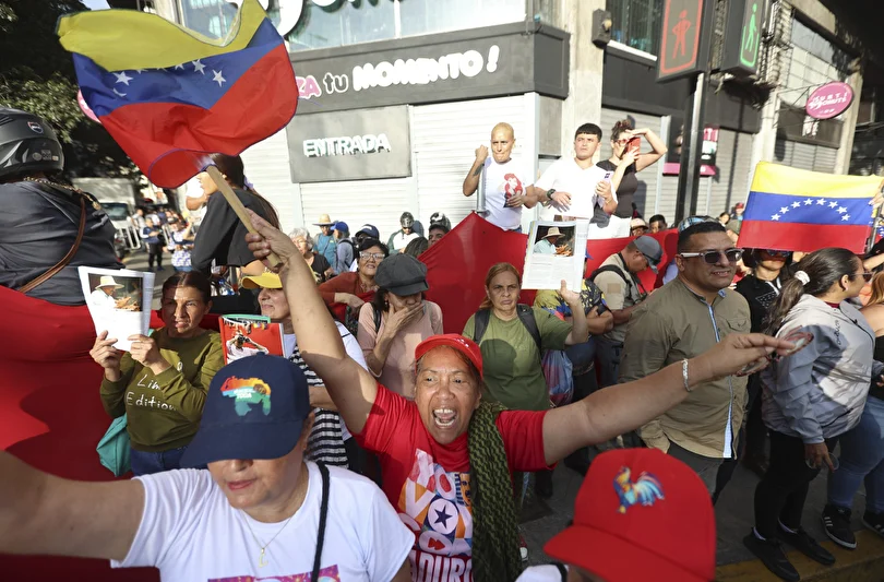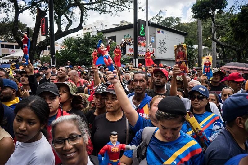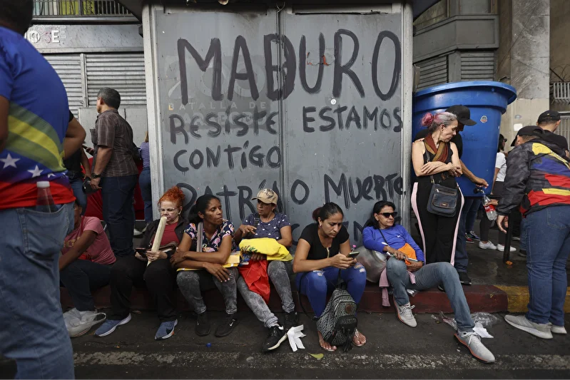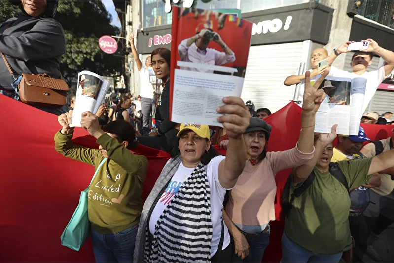 kent merkezinde de binlerce kişi ABD’nin cumartesi gece operasyonuyla Başkan Maduro ve eşi Cilia Flores’i kaçırmasını kınamak için “Venezuela için Büyük Yürüyüş” adı altında gösteri yaptı.