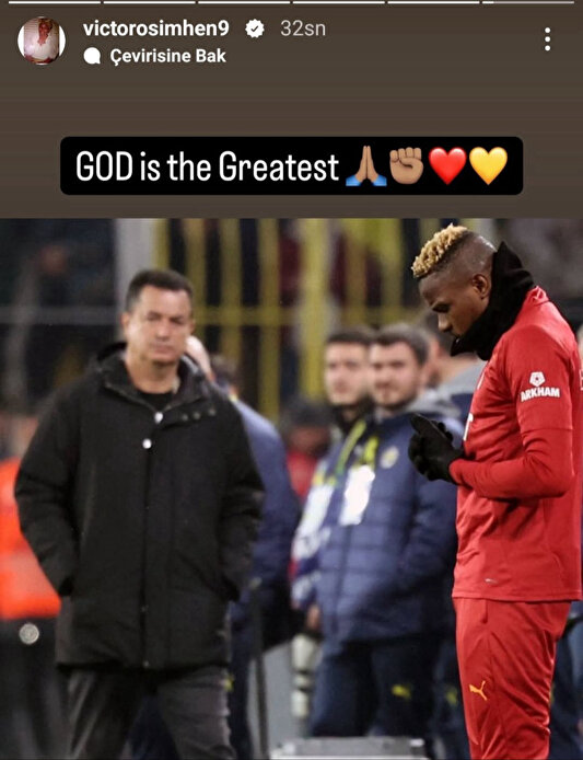 Osimhen, Fenerbahçe Asbaşkanı Acun Ilıcalı’nın kendisine baktığı bir fotoğrafı paylaşarak “Tanrı en büyüktür” notunu düştü.