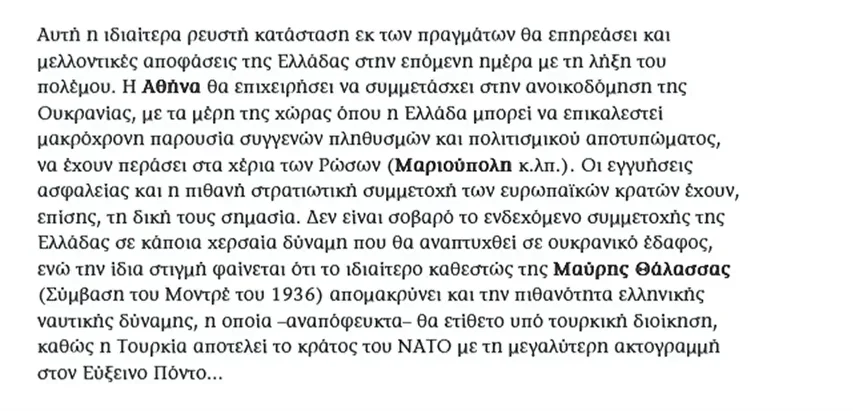 “Karadeniz’de kurulacak güvenlik düzeni henüz netleşmiş değil. Savaşın sona ermesinden sonraki dönem, Yunanistan’ın alacağı kararları da etkileyecektir. Atina, Yunanistan’ın uzun süredir akrabalık bağları ve kültürel izleri bulunan bölgelerin Rusların eline geçmesi (Mariupol vb.) nedeniyle Ukrayna’nın yeniden inşasına katılmaya çalışacaktır. Güvenlik garantileri ve Avrupa devletlerinin muhtemel askeri katılımı da kendi önemine sahiptir. Yunanistan’ın Ukrayna topraklarında kurulacak bir kara gücüne katılma ihtimali ciddi değildir. Karadeniz’in özel statüsü olan 1936 Montrö Sözleşmesi ise Yunan deniz gücünün katılım ihtimalini uzaklaştırmaktadır. Bu koşullarda kurulabilecek bir deniz gücü, Türkiye’nin Karadeniz’deki en uzun kıyı şeridine sahip NATO üyesi ülke olması nedeniyle kaçınılmaz olarak Türkiye’nin komutası altında olacaktır.”