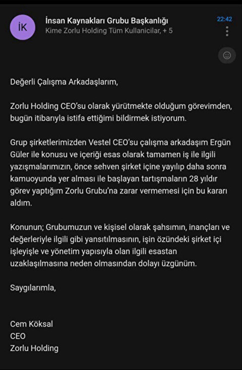 “Değerli Çalışma Arkadaşlarım, Zorlu Holding CEO’su olarak yürütmekte olduğum görevimden, bugün itibarıyla istifa ettiğimi bildirmek istiyorum.