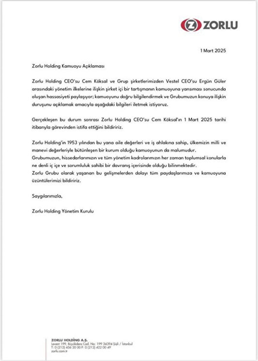 Konunun kamuoyuna yansıdıktan sonra oluşan hassasiyetin paylaşıldığı belirtilen açıklamada, “Gerçekleşen bu durum sonrası Zorlu Holding CEO’su Cem Köksal’ın 1 Mart 2025 tarihi itibarıyla görevinden istifa ettiğini bildiririz.” denildi.